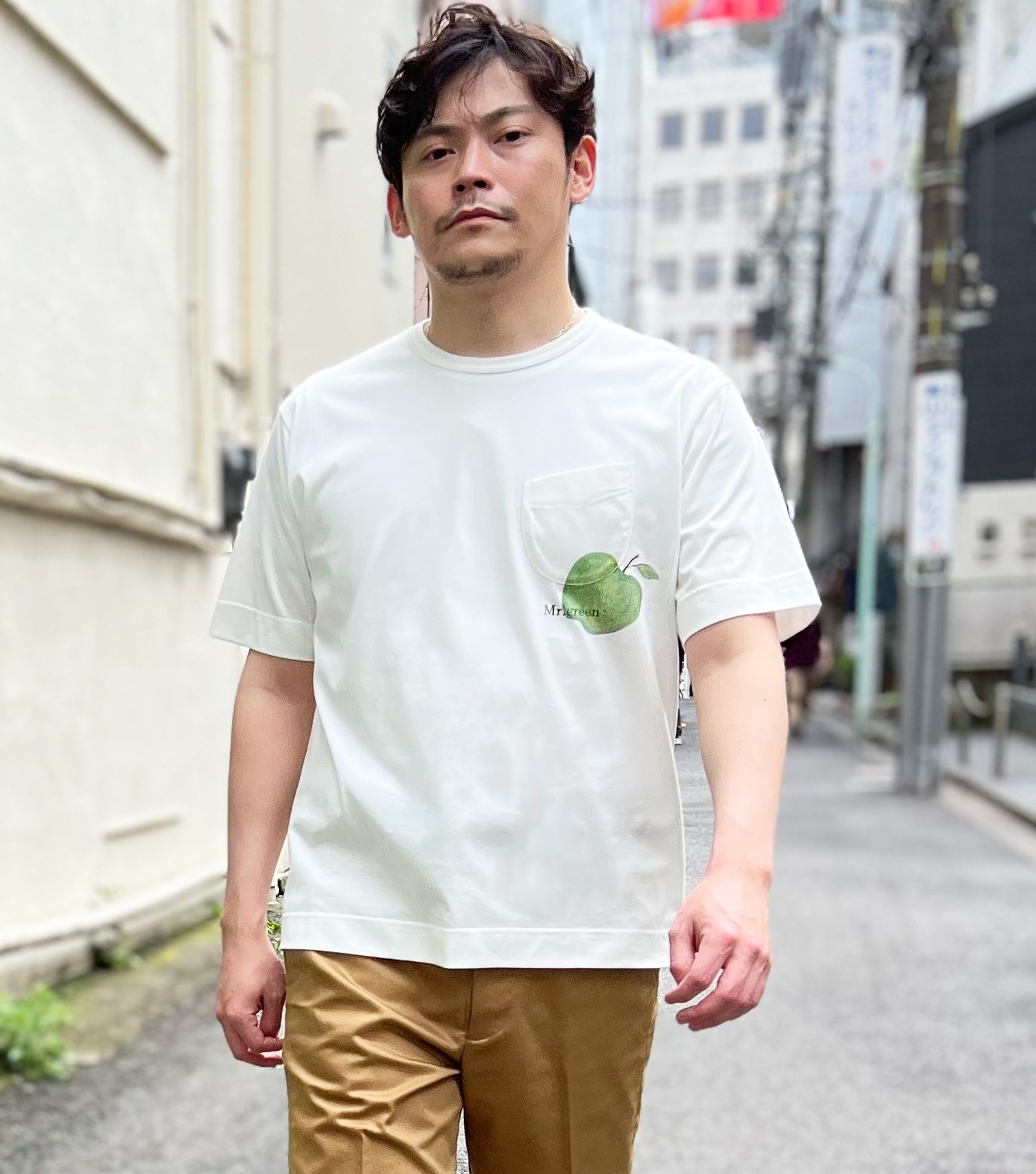 特徴的な斜めのラウンドポケットとフレッシュなワンポイントプリント、カリギュラフィーメッセージのカットソーコレクションです。